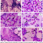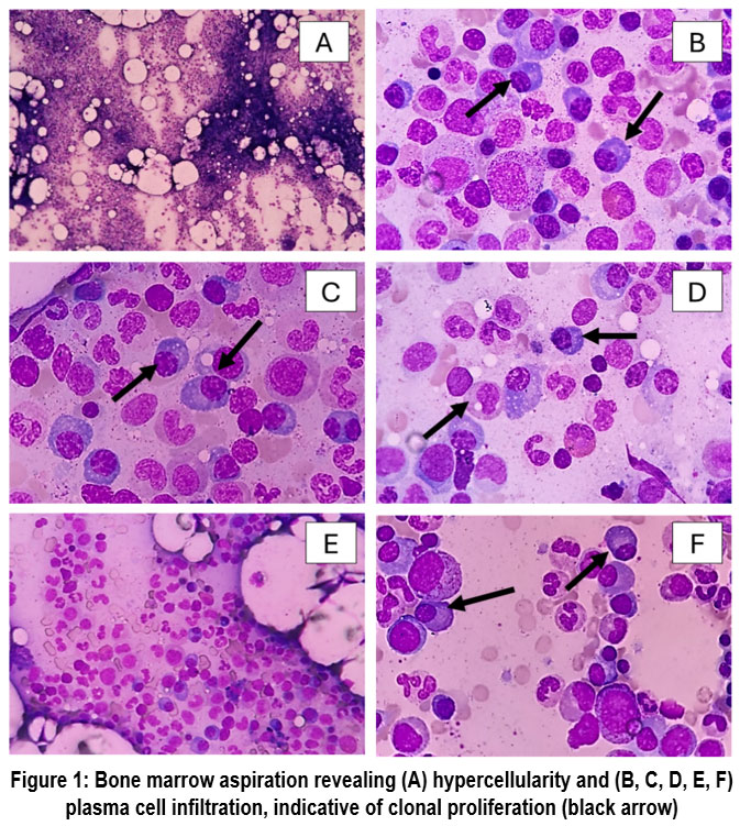 Figure 1: Bone marrow aspiration revealing (A) hypercellularity and (B, C, D, E, F) plasma cell infiltration, indicative of clonal proliferation (black arrow). |