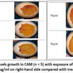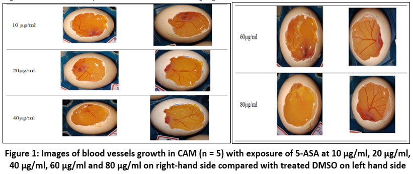 Chorio allantoic membrane (CAM) of White Leghorn fertilized eggs is a widely used and recognized method for examining the angiogenesis and anti-angiogenic potential of small molecules. The CAM assay procedure is useful because of its versatile and rapid nature of formation of membrane within 4-5 days of embryonic development. Previous studies have used this protocol to study angiogenesis. After being collected, the eggs were incubated at 37 0 Celsius for 8 to 9 days. The air sac of each egg shell was then exposed through using sterilized scissors performing an incision on upper side of each egg shell. A small amount of light liquid paraffin was gently applied with cotton swabs to expose the chorioallantoic membrane, to make the vascular system of the egg more visible. Different concentrations of 5-ASA (20µl, 40µl, 60 µl, 80µl) were prepared using DMSO. The chorioallantoic membrane of chick embryos was treated with different concentrations of the drug solution. After application of drug solution, the eggs were observed at different time intervals. Image analysis was used to quantify the angiogenesis.25