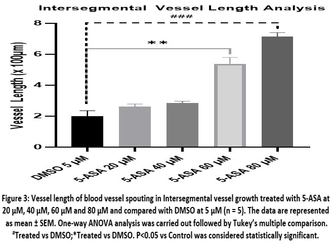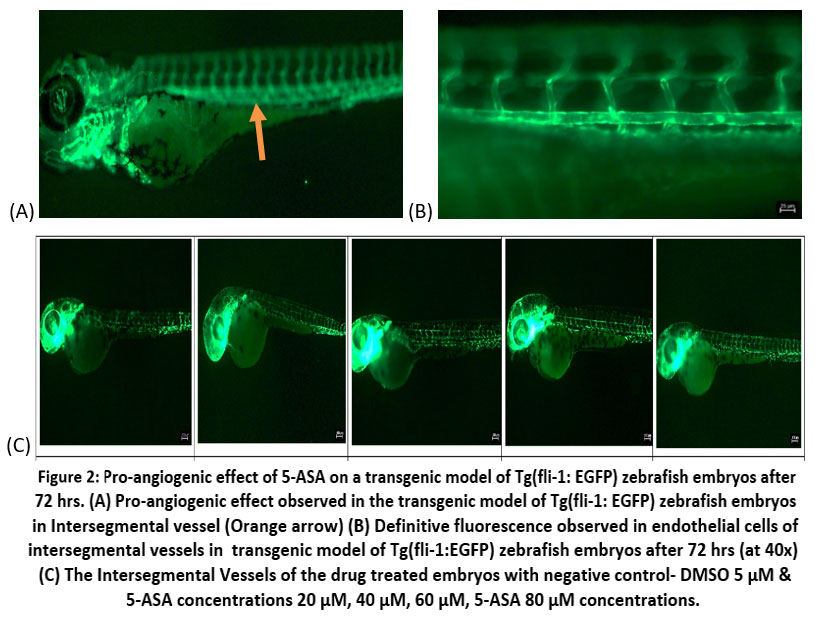 Transgenic zebrafish line Tg (fli1:EGFP)y1 is a valuable tool for studying angiogenesis. Driver gene fli1 promoter is an oncogene that drives the expression of enhanced green fluorescent protein (EGFP) in the endothelial cells of vasculature of the zebrafish, allowing for the visualization of blood vessels in live embryos. This action is mediated through VEGF-2 receptor. Therefore, the EGFP expression with the influence of drugs can be used to analyze the blood vessel growth. Angiogenesis was assessed by counting the number of complete intersegmental vessels (ISV) at 72 hours post fertilization (hpf) as shown in figure 2(A) & (B) and performing a vessel analysis using ImageJ plugin.The pro-angiogenic effect of 5-ASA treatment became most prominent in transgenic zebrafish embryos at an 80 μM dosage level, as it produced a maximum enhancement of intersegmental vessel formation. DMSO, as a negative control, causes the destruction of blood vessels and hence allows us to compare the angiogenic potential of treated groups. As shown in fluorescence imaging figure 2(C) and vessel analysis in figure 3 exhibit significantly higher ISV development after administering 5-ASA to transgenic embryos at significantly elevated in concentrations from 60-80 μM. A quantitative assessment supports 5-ASA’s angiogenic effect by VEGF-2 receptor pathway activation, which leads to elevated EGFP expression within transgenic embryos.