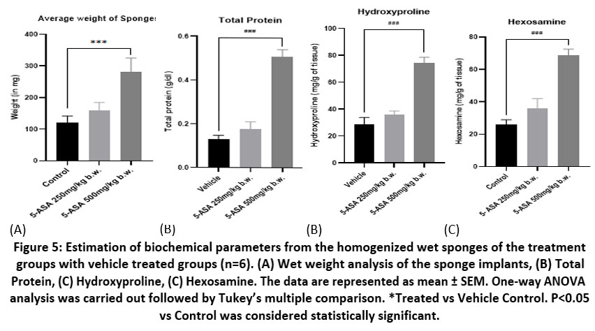 PVA sponge- a porous, artificial sponge made of inert, non-biodegradable material. Sponge is soft enough to be sectioned for histopathological examinations and easy for tissue homogenization. The model is used to analyze the effects of drugs on granulation tissue formation, collagen deposition, and wound repair. In this study, the PVA sponge was injected with different concentrations derived from previous studied acute dermal toxicity study. Figure 4 (A) & (B) shows PVA sponges exposed to 5-ASA treatment showed increased weight values besides elevated total protein content and elevated hydroxyproline and hexosamine level, along with enhanced neovascularization and collagen deposition patterns as revealed by histological observations. The PVA sponge implantation model shows that 5-ASA promotes substantial increases in cellular infiltration alongside collagen formation and neovascularization, whose effects depend on the medication dosage. Figure 5 shows the results from biochemical estimations and Figure 6 shows the histopathological examinations that confirm that 5-ASA produces pro-angiogenic effects in living tissues, which strengthens its case for wound healing usage.