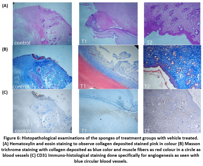 Figure 6: Histopathological examinations of the sponges of treatment groups with vehicle treated. (A) Hematoxylin and eosin staining to observe collagen deposited stained pink in colour.Click here to view Figure |