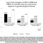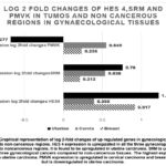 Expression of HES4 mRNA and protein were estimated in non-cancerous cervix, breast and endometrium in transcripts per million. Highest expression was observed in endometrium. The expression of HES 4 mRNA was found to be upregulated in all three tissue types, in comparison to non-cancerous tissues. The uterine tumor tissue showed the greatest fold change (Table 1)