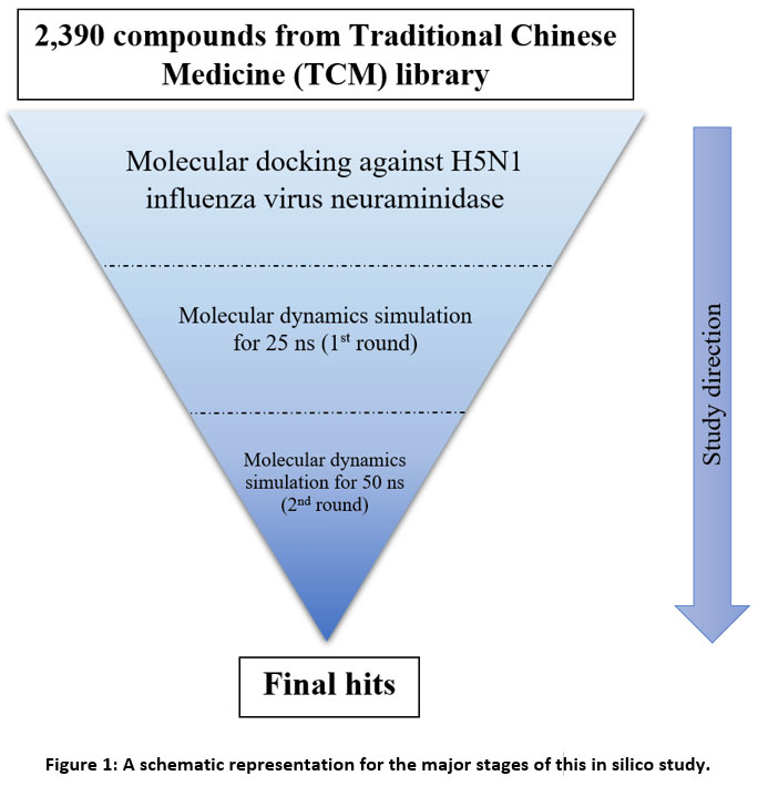 An outline for the major steps of this virtual screening study can be viewed in Figure 1. Briefly, the first step of this study involved docking of the compounds in the TCM library against the H5N1 influenza virus neuraminidase. Then, the best ten compounds in the docking output with the least energy of binding were subjected to the next step. In the second step of this study, these top ten compounds were submitted to molecular dynamics (MD) simulation for 25 nanoseconds. In this initial round of MD simulation, the ligand movement was reported as root mean square deviation (RMSD). As such, only those compounds with a mean ligand movement RMSD less than 4 Angstrom were submitted to the second round of MD simulation for 50 nanoseconds. Finally, the final hits were selected from the second simulation based on both mean ligand movement RMSD (less than 4 Angstrom) and average molecular mechanics-Poisson Boltzmann surface area (MM-PBSA) binding energy.