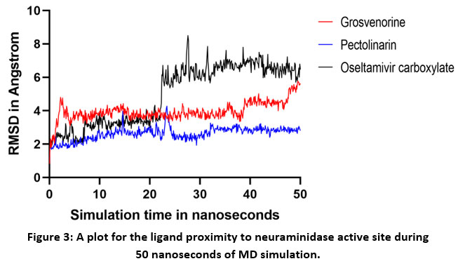 In the final stage of this computation study, the best ten hit compounds were subjected to MD simulation study for two consecutive rounds of 25 and 50 nanoseconds. The overall results of these two rounds were presented in Table 4. As observed in this table, the proximity of each hit compound to neuraminidase active site was calculated as a mean value for ligand movement RMSD. As shown in Table 4, only five compounds were able to record mean ligand movement RMSD value of less than 4 Angstrom during 30 nanoseconds simulation interval. Then, these five hit compounds were subjected to the second round of MD simulation for 50 nanoseconds. Throughout this second round, only grosvenorine and pectolinarin were able to keep a low mean ligand movement RMSD of 3.97 and 2.63 Angstrom respectively. As compared to other hits in Table 4, the compound pectolinarin had the least average MM-PBSA binding energy of -115.24 Kcal/mol. A detailed plot for the proximity of grosvenorine, pectolinarin and oseltamivir carboxylate to neuraminidase active site can be seen in Figure 3 during 50 nanoseconds period. Unlike grosvenorine and pectolinarin, it is very clear that the ligand oseltamivir carboxylate had started moving away from neuraminidase active site after 22 nanoseconds of simulation as presented in Figure 3.