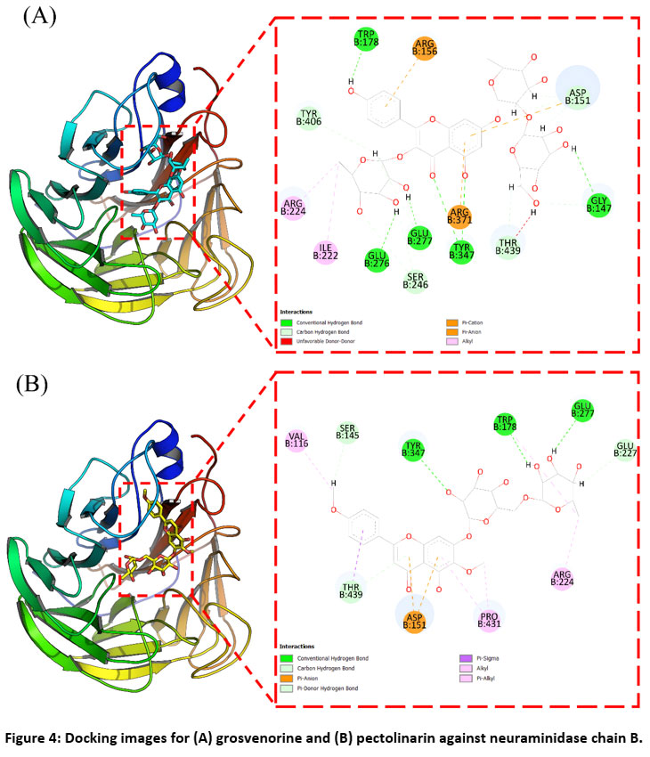Figure 4: Docking images for (A) grosvenorine and (B) pectolinarin against neuraminidase chain B.Click here to view Figure |
