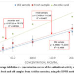 Figure 1 shows the percentage of inhibition-concentration curves of ascorbic acid in the fresh and old samples of AS using the DPPH method.