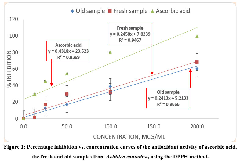 Figure 1: Percentage inhibition vs. concentration curves of the antioxidant activity of ascorbic acid, the fresh and old samples from Achillea santolina, using the DPPH method.Click here to view Figure |