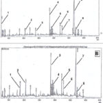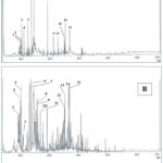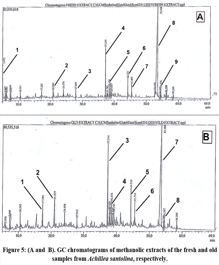 Figure 4 (A and B) shows the GC chromatograms of the volatile oil of the fresh and old samples from AS, respectively. The extraction was carried out with the Clevenger distillation technique. The numbered peaks refer to the major compounds which are listed in Table 1.