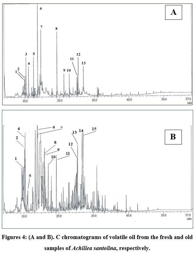 Figures 4: (A and B). C chromatograms of volatile oil from the fresh and old samples of Achillea santolina, respectively.Click here to view Figure |