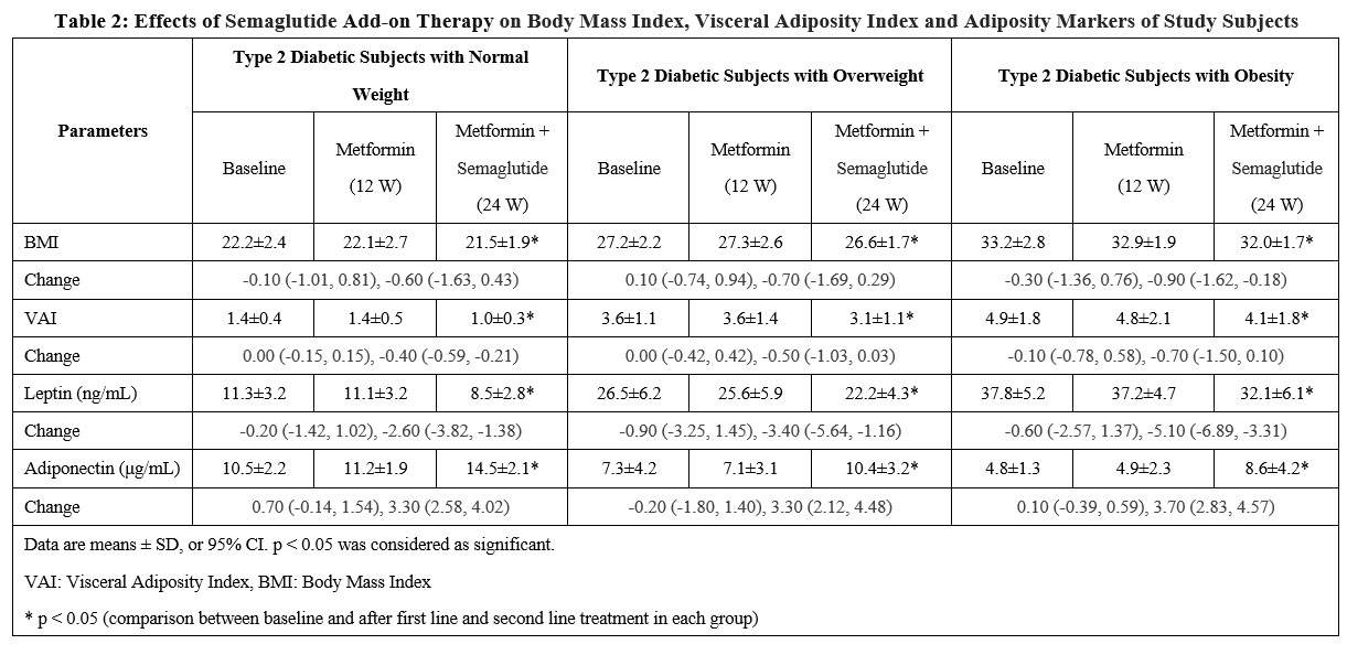 Table 2: Effects of Semaglutide Add-on Therapy on Body Mass Index, Visceral Adiposity Index and Adiposity Markers of Study Subjects |