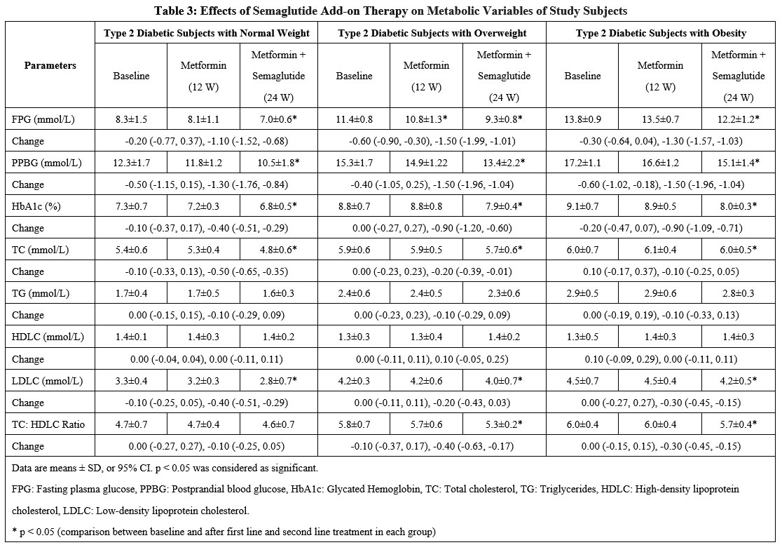 Table 3: Effects of Semaglutide Add-on Therapy on Metabolic Variables of Study Subjects |