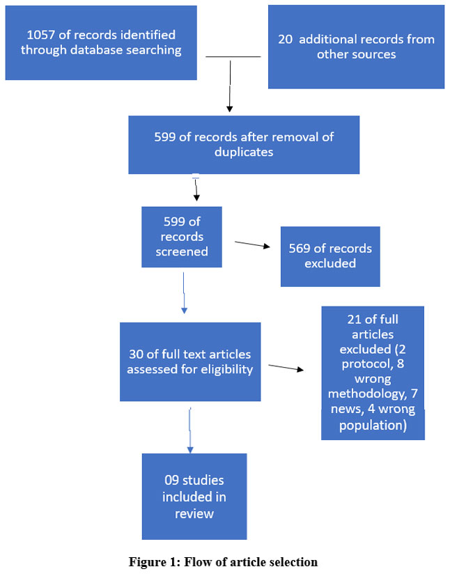 The search yielded 1,077 potentially relevant records. After evaluation, 30 full-text articles were scrutinized for eligibility and 9 studies included in the review bases on study titles, abstracts and completed trials from ClinicalTrials.gov (Table 1).
