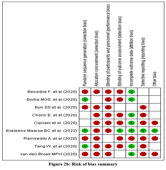 The studies were carried out in the USA, China, Brazil, France and the Netherlands. Trials enrolled individuals with confirmed or suspected cases of COVID-19 and included critically as well as non-critically ill COVID 19 patients, requiring hospitalization. All trials had a parallel design, classified as Phase 2/ Phase 3 and were registered on ClinicalTrials.gov. Dosage regimens of HCQ were different between studies and QTc Interval was assessed at baseline and up to 2- or 3-days post therapy. Most studies had a low risk for random sequence selection and attrition bias, there was potential risk for allocation concealment, performance, detection, and reporting bias (Figures 2a, 2b).19-27
