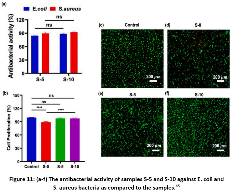 Figure 11: (a-f) The antibacterial activity of samples S-5 and S-10 against E. coli and S. aureus bacteria as compared to the samples.45