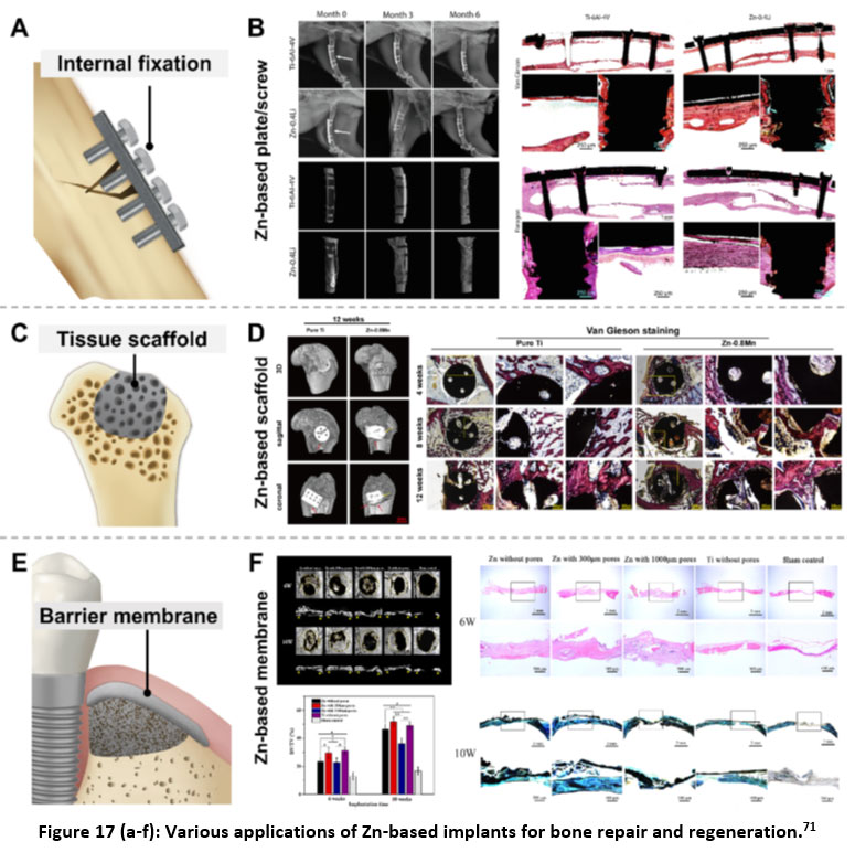 Yin et al.65 observed no symptoms of severe inflammation, platelet aggregation, thrombosis, or intimal hyperplasia. Similarly, Zhou et al.66 found no inflammation or thrombus formation in coronary arteries following two years of Zn-0.8Cu alloy stent implantation. Young pigs’ iliofemoral arteries were treated with Zn–3Ag alloy stents by He et al.67, and the outcomes showed satisfactory healing without thrombosis or vascular obstruction. When Chen et al.68 implanted Zn-xMg alloys in the rat abdominal aortas, they noticed comparatively little inflammation and intimal activation. Rats’ abdominal aortas were implanted with Zn-0.1Li alloys by Ma et al.69, who observed a minor inflammatory reaction. When Drelich et al.70 implanted Zn-xAl alloy strips in the rat abdominal aortas, they saw a little inflammatory reaction. The several uses of zinc-based implants for bone regeneration and repair are shown in Fig. 17.71