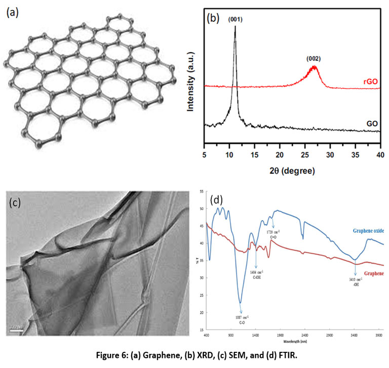 Figure 6: (a) Graphene, (b) XRD, (c) SEM, and (d) FTIR.