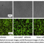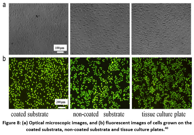 Figure 8: (a) Optical microscopic images, and (b) fluorescent images of cells grown on the coated substrata, non-coated substrata and tissue culture plates.40