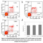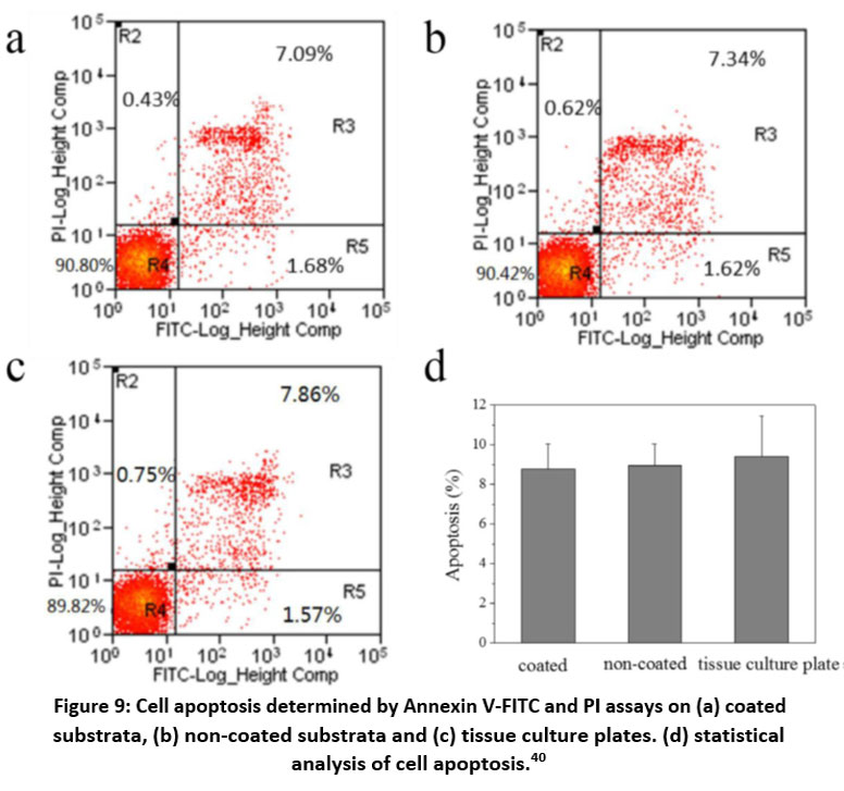 Figure 9: Cell apoptosis determined by Annexin V-FITC and PI assays on (a) coated substrata, (b) non-coated substrata and (c) tissue culture plates. (d) statistical analysis of cell apoptosis.40