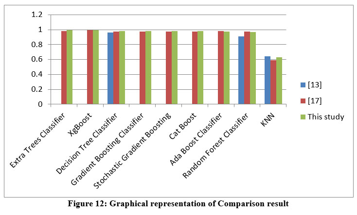 The proposed model’s accuracy when compares with already existing research by different researchers13 and researchers17 using various machine learning classifiers like Extra Trees Classifier, XgBoost, Decision Tree Classifier, Stochastic Gradient Boosting, Gradient Boosting Classifier, Cat Boost, Random Forest Classifier, KNN, Ada Boost Classifier, itt was found that the suggested model’s accuracy rate is significantly higher than that of previous research13 and research 17 is shown in the Table 12 and figure 12 as: