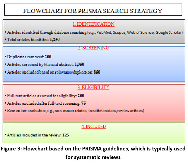 A comprehensive literature search was conducted using databases such as PubMed, Scopus, Web of Science, and Google Scholar up to 2025. The search utilized the keywords “Hedyotisdiffusa,” “cancer,” “anticancer activity,” “mechanism of action,” “toxicity,” “drug interaction,” and “phytochemicals,” with Boolean operators (AND, OR, NOT) to refine the results. Initially, 1,250 articles were retrieved. After removing 200 duplicates and screening titles and abstracts for relevance, 850 articles were excluded due to irrelevance or duplication. Full-text screening was conducted on the remaining 200 articles, resulting in the inclusion of 125 studies based on the inclusion and exclusion criteria. The inclusion criteria encompassed original research articles published in English, focusing on the anticancer effects of Hedyotisdiffusa through in vitro, in vivo, or clinical studies. Exclusion criteria included review articles, editorials, conference abstracts, non-English articles, and studies that did not specifically address cancer or the anticancer mechanisms of Hedyotisdiffusa. (Fig.3.), illustrate the research process based on the PRISMA guidelines, which is typically used for systematic reviews.