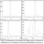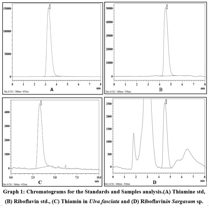 Graph 1: Chromatograms for the Standards and Samples analysis.(A) Thiamine std, (B) Riboflavin std., (C) Thiamin in Ulva fasciata and (D) Riboflavinin Sargasum sp.Click here to view Graph |