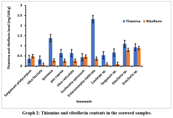 Graph 2: Thiamine and riboflavin contents in the seaweed samples.Click here to view Graph |
