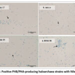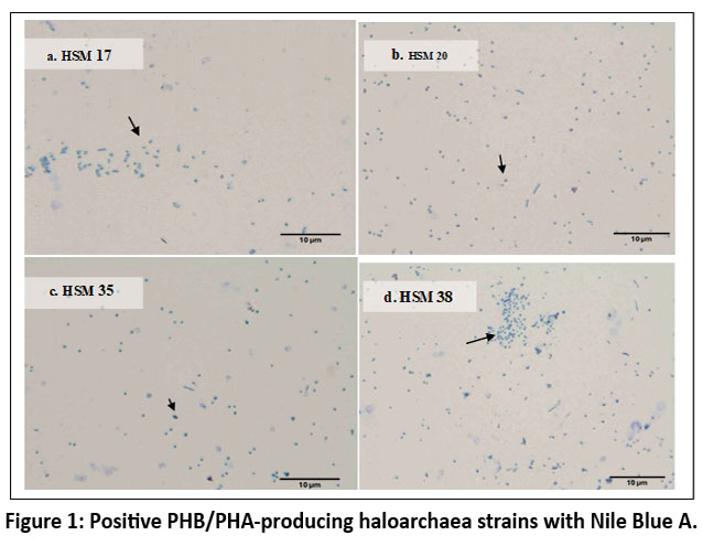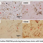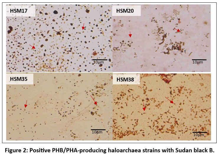 The ability of all the Haloarchaea strains to accumulate PHB/PHA was examined. Nile Blue A and Sudan Black B staining revealed that only four strains (HSM 17, HSM20, HSM35, and HSM38) were promising strains (Figure. 1 and 2)