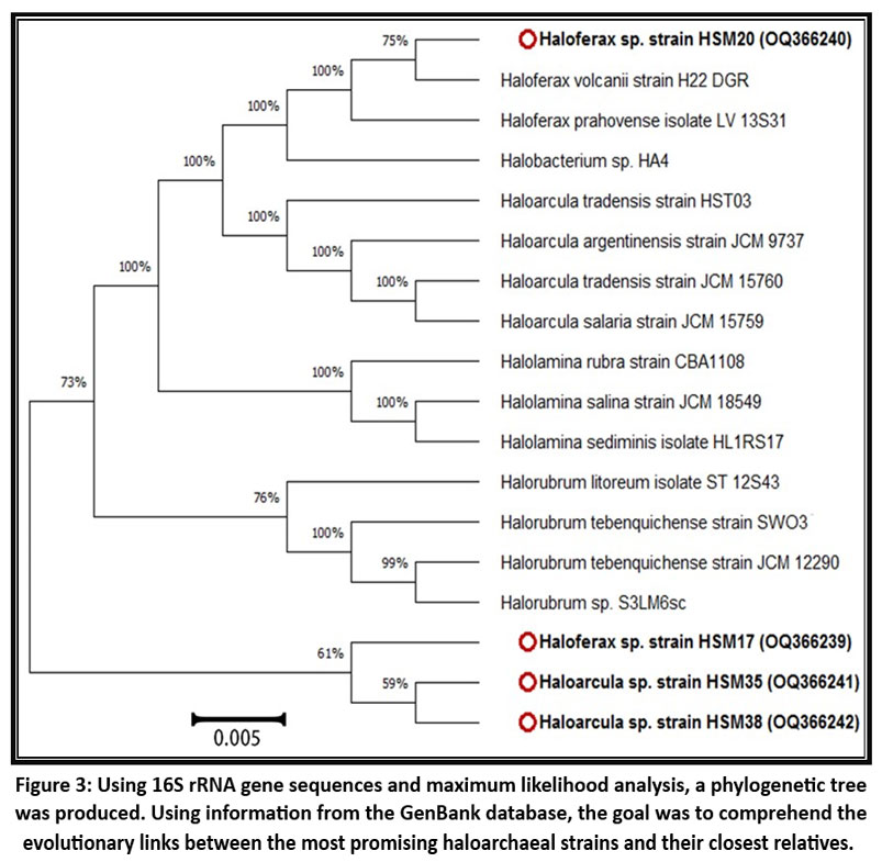 BLAST was used to identify the DNA sequences and compare the results with information from the NCBI GenBank database. According to phylogenetic analysis based on incomplete 16S rRNA gene sequences, the most promising strains belonged to the genera Haloarcula and Haloferax and exhibited sequence similarity of ≥95%. The NCBI and GenBank nucleotide sequence databases have received the 16S rRNA gene sequencing, and the accession numbers range from OQ366239 to OQ366242 (Figure.3).
