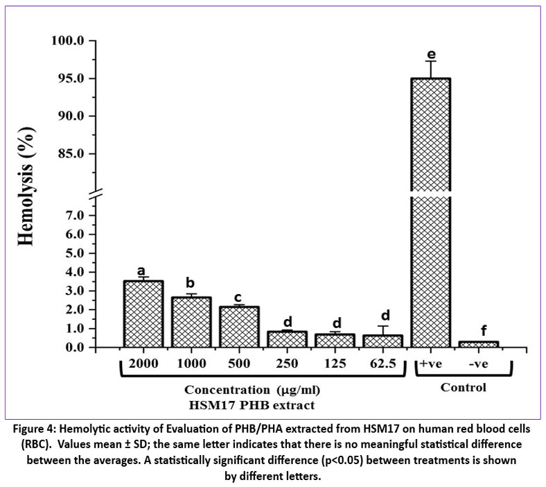 Figure 4: Hemolytic activity of Evaluation of PHB/PHA extracted from HSM17 on human red blood cells (RBC). Values mean ± SD; the same letter indicates that there is no meaningful statistical difference between the averages.Click here to view Figure |