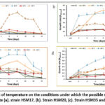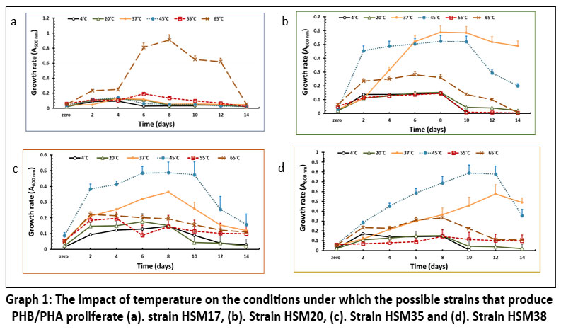 Graph 1: The impact of temperature on the conditions under which the possible strains that produce PHB/PHA proliferate (a). strain HSM17, (b). Strain HSM20, (c). Strain HSM35 and (d). Strain HSM38Click here to view Graph |
