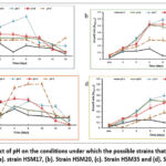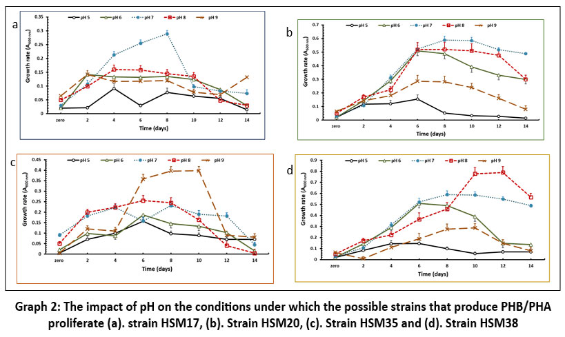 Graph 2: The impact of pH on the conditions under which the possible strains that produce PHB/PHA proliferate (a). strain HSM17, (b). Strain HSM20, (c). Strain HSM35 and (d). Strain HSM38Click here to view Graph |