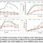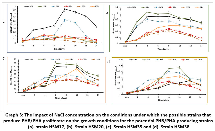 Graph 3: The impact of NaCl concentration on the conditions under which the possible strains that produce PHB/PHA proliferate on the growth conditions for the potential PHB/PHA-producing strains (a). strain HSM17, (b). Strain HSM20, (c). Strain HSM35 and (d). Strain HSM38Click here to view Graph |