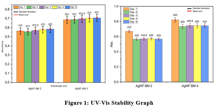 The UV-Vis spectrophotometer was used to measure the stability of the nanoparticles based on UV-Vis absorption spectra. The analysis was conducted daily for five consecutive days at wavelengths between 400-450 nm.