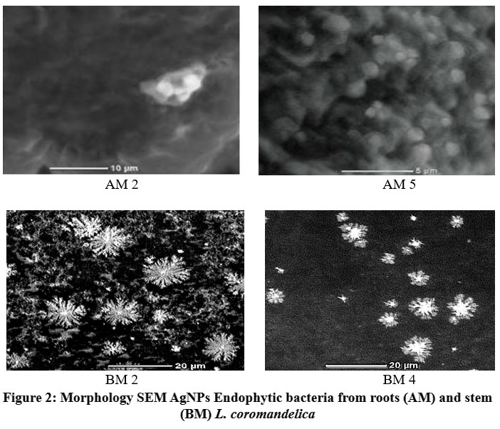 Figure 2: Morphology SEM AgNPs Endophytic bacteria from roots (AM) and stem (BM) L. coromandelica |