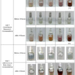 The biosynthesis of silver nanoparticles was carried out using endophytic bacteria from the stems and roots of L. coromandelica. The bacteria used included Micrococcus (BM 2), Enterococcus (BM 4 and AM 2), and Azotobacter (AM 5). The biosynthesis process lasted for 48 hours with incubation on a shaker (200 rpm, 37°C) in the dark, followed by sonication for 1 hour at 40 kHz. A color change from cloudy to dark brown at certain concentrations indicated the formation of silver nanoparticles (AgNPs), as shown in Table 1, marked by the color change to dark brown (+). This result is consistent with other studies, which reported that a color change to dark brown or deep brown was observed after 24-48 hours of incubation. The color change is an indication of the formation of AgNPs.10