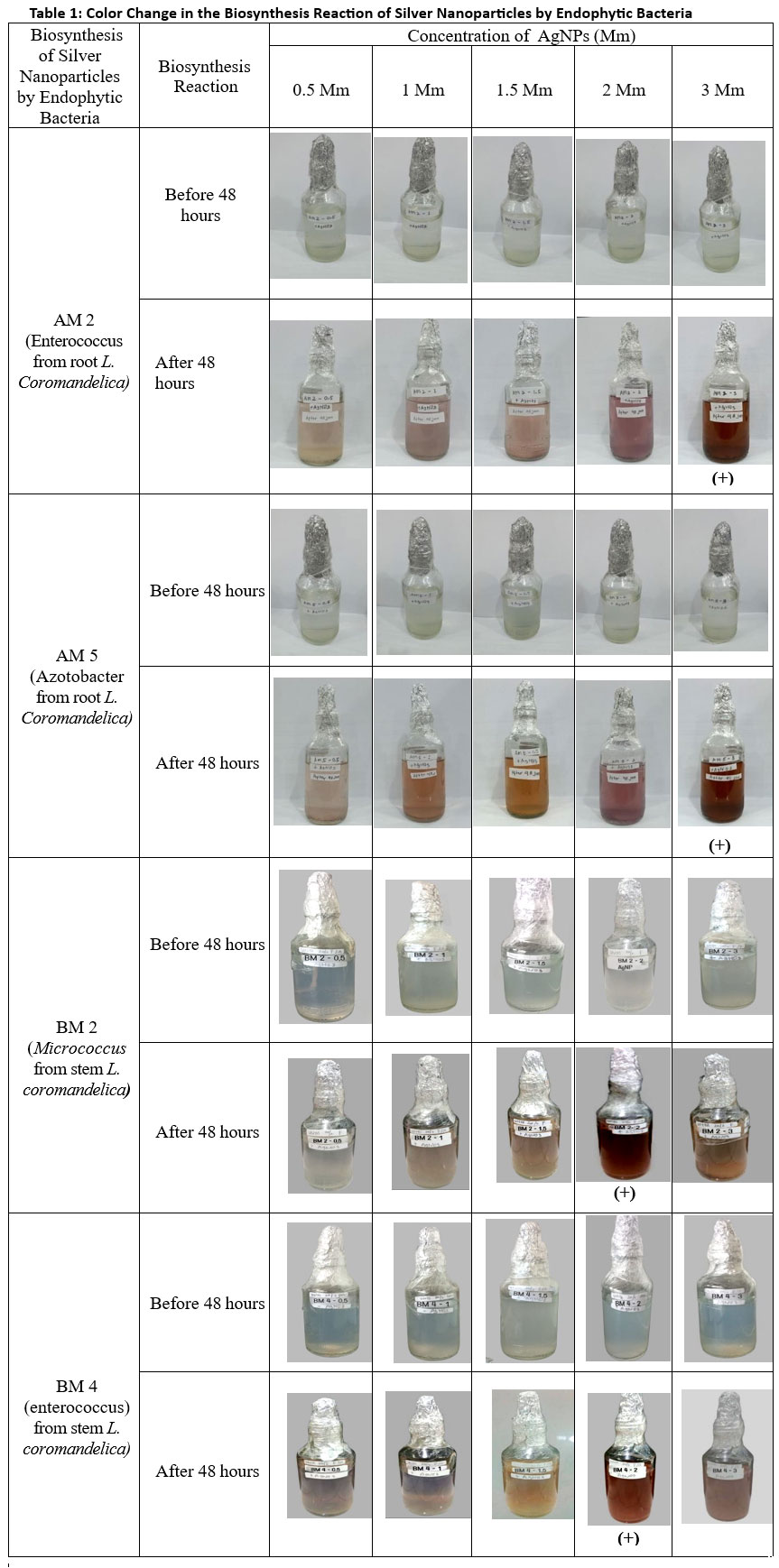 Table 1: Color Change in the Biosynthesis Reaction of Silver Nanoparticles by Endophytic Bacteria |