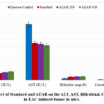 As vital organs for the body’s overall metabolism and excretion, the liver and kidney may be impacted during cancer treatment. Because cancer changes the body’s normal physiological state, it might impact the kidney and liver. To determine whether test samples can lessen the harmful effects of cancer on these essential organs, various significant liver and kidney markers’levels were calculated from the serum extracted from the blood of animals receiving treatment.ALT, AST, bilirubin, and creatinine levels in mice are generally 17–77 IU/L, 54–298 IU/L, 8–33 mg/dl, and 0.2–0.9 mg/dl, respectively.47Table 4 shows that the kidney marker values were altered in the disease control group, whereas the liver marker values were slightly higher. Nevertheless, the creatinine level was not maintained with the standard medication 5-FU. Aqueous leaf extract, however, efficiently maintained the levels of both liver and kidney indicators at dosages of 200 and 400 mg/kg body weight (the bilirubin level fluctuated very little at the 200 mg/kg dosage). In light of this, it can be concluded that the extract may benefit the kidney and liver when treating cancer.