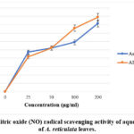Test tubes were filled with 4.0 ml of test fraction and the standard (ascorbic acid) in varying concentrations (400μg/ml, 200μg/ml, 100μg/ml, 50μg/ml, 25μg/ml). The test tubes received 1.0 ml of a Sodium nitroprusside (5mM solution added to them). To finish the reaction, the test tubes were incubated at 30°C for two hours. After taking 2.0 ml of the solution out of the mixture, 1.2 ml of Griess reagent was added. Next, a spectrophotometer was used to assess the solutions’ absorbance at 550 nm in comparison to a blank. The blank was distilled water.11