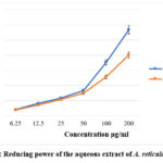 2.0 ml of standard solutions of various concentrations or plant extractwas taken in different test tubes. Then, 2.5 ml potassium ferricyanide solution (1%) was added. After that, incubation for 10 minutes at 50°C was conducted and then filled with 2.5 ml of trichloroacetic acid solution (10%). Centrifugation for 10 minutes at 3000 rpm of the mixture was performed.After mixing with 2.5 ml of distilled water, extraction of 2.5 ml of the supernatant solution was done. Then 0.5 ml of ferric chloride solution (0.1%) was added. The absorbance of the solutions was measured at 700 nm using a spectrophotometer. The absorbance of the blank solution at 700 nm was measured in relation to the solvent that was used to make it. Greater reducing power was demonstrated by the reaction mixture’s increased absorbance.