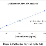 Gallic acid solutions at various concentrations or plant extract (200μg/ml) both in volume of 1.0 ml were taken and kept in test tubes. Folin-Ciocalteu reagent solution (5 ml)that was diluted 10 times was added. After the addition of 4 ml sodium carbonate solution (7.5%), the test tubes were well mixed. The reaction was completed by incubating test tubes containing extract solutions for one hour at the same temperature (20°C). The solutions’ absorbance was measured at 765 nm by using spectrophotometer. A standard blank solution contained ethanol, which dissolved the plant extract.13-14Utilizing standard formula; the total phenolic contents of the plant fraction was measured and expressed as gallic acid equivalents (GAE).16