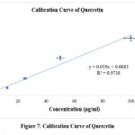 One ml of reference solution in various concentrations or plant extract (200μg/ml) was taken in test tubes. 3 ml of chloroform was placed in test tubes. Then, eventually added aluminium chloride solution (200 μl), potassium acetate solution (200 μl) and purified water (5.6 ml). Then for completion of the reaction 30 minutes incubation period at room temperature was carried out.Utilizing a spectrophotometer the absorbance was measured at 415 nm and compared to a blank. Chloroform served as the blank.15-17To calculate total amount of flavonoid components standard formula was used and represented in quercetin equivalents.