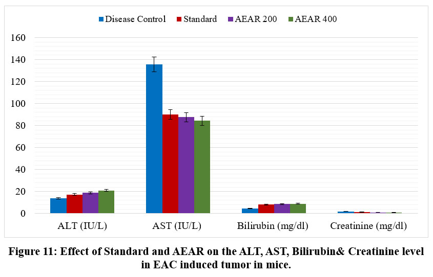 As vital organs for the body’s overall metabolism and excretion, the liver and kidney may be impacted during cancer treatment. Because cancer changes the body’s normal physiological state, it might impact the kidney and liver. To determine whether test samples can lessen the harmful effects of cancer on these essential organs, various significant liver and kidney markers’levels were calculated from the serum extracted from the blood of animals receiving treatment.ALT, AST, bilirubin, and creatinine levels in mice are generally 17–77 IU/L, 54–298 IU/L, 8–33 mg/dl, and 0.2–0.9 mg/dl, respectively.47Table 4 shows that the kidney marker values were altered in the disease control group, whereas the liver marker values were slightly higher. Nevertheless, the creatinine level was not maintained with the standard medication 5-FU. Aqueous leaf extract, however, efficiently maintained the levels of both liver and kidney indicators at dosages of 200 and 400 mg/kg body weight (the bilirubin level fluctuated very little at the 200 mg/kg dosage). In light of this, it can be concluded that the extract may benefit the kidney and liver when treating cancer.