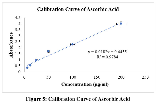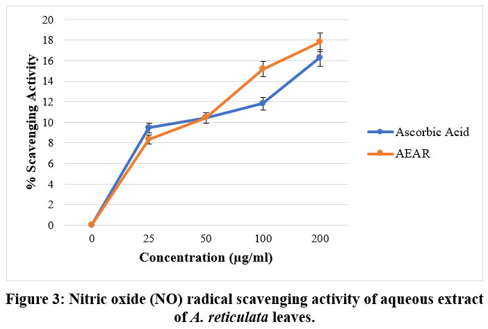 Test tubes were filled with 4.0 ml of test fraction and the standard (ascorbic acid) in varying concentrations (400μg/ml, 200μg/ml, 100μg/ml, 50μg/ml, 25μg/ml). The test tubes received 1.0 ml of a Sodium nitroprusside (5mM solution added to them). To finish the reaction, the test tubes were incubated at 30°C for two hours. After taking 2.0 ml of the solution out of the mixture, 1.2 ml of Griess reagent was added. Next, a spectrophotometer was used to assess the solutions’ absorbance at 550 nm in comparison to a blank. The blank was distilled water.11