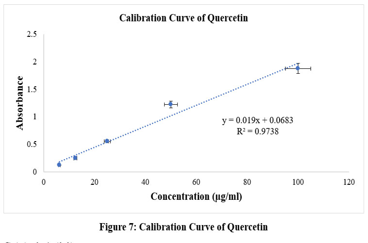 One ml of reference solution in various concentrations or plant extract (200μg/ml) was taken in test tubes. 3 ml of chloroform was placed in test tubes. Then, eventually added aluminium chloride solution (200 μl), potassium acetate solution (200 μl) and purified water (5.6 ml). Then for completion of the reaction 30 minutes incubation period at room temperature was carried out.Utilizing a spectrophotometer the absorbance was measured at 415 nm and compared to a blank. Chloroform served as the blank.15-17To calculate total amount of flavonoid components standard formula was used and represented in quercetin equivalents.