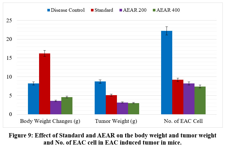Experimental animals’ body weight changes during the course of treatment are closely observed during the assessment of the extract’s anti-cancer potential. For ascertaining the anti-cancer property of test materials, the tumor weight and quantity of EAC cells in ascitic fluid are computed for each group.22-24Table 2 makes it evident that the standard 5-FU treated group’s body weight change outcome was quite concerning. The change in body weight for the disease control group was also noteworthy. However, the body weight change outcomes for the groups treated with aqueous extract (both for 200 mg/kg and 400 mg/kg dosages) were lower than those for the disease control and standard groups. It is notable that the body weight change values further lowers with increasing concentration of the test extract. It was found that the tumor weight values obtained from the test extract and 5-FU treatment groups were lower than those obtained from the disease control group. It is also apparent that tumor weight reduces when the aqueous extract dosage increases. Additionally, it was discovered that the quantity of EAC cells observed decreased in both the standard and test extract treated groups; moreover, it was noticed that the amount of EAC cells decreased as the dose of aqueous leaf extract increased. The test extract’s 400 mg/kg body weight dosage produced the strongest anticancer effect, surpassing that of the common medication 5-FU. It is clear from the explanation above that the extract’s anti-cancer activity rises as the dosage does (Figure 11).