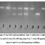 Genotyping of the AnCoEn polymorphism was performed using gel electrophoresis, as illustrated in Figure I. The lanes labeled 2, 3, 4, 8, and 12 display the homozygous I/I genotype with a 190 bp band. Lanes 5, 6, and 7 contain the heterozygous ID genotype characterized by both 190 bp and 490 bp bands. Lanes 9 and 11 show the D/D genotype with a 490 bp band.