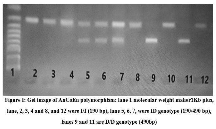 Figure I: Gel image of AnCoEn polymorphism: lane 1 molecular weight maher1Kb plus, lane, 2, 3, 4 and 8, and 12 were I/I (190 bp), lane 5, 6, 7, were ID genotype (190/490 bp), lanes 9 and 11 are D/D genotype (490bp). |