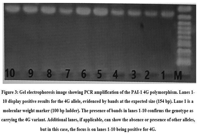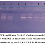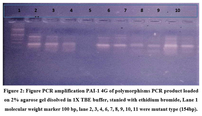 PCR analysis for PAI-1 4G polymorphisms is shown in Figure 2. The gel reveals bands at approximately 154 bp, indicating the presence of the 4G allele in lanes 2, 3, 4, 6-11, confirming the detection of the mutant genotype.