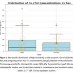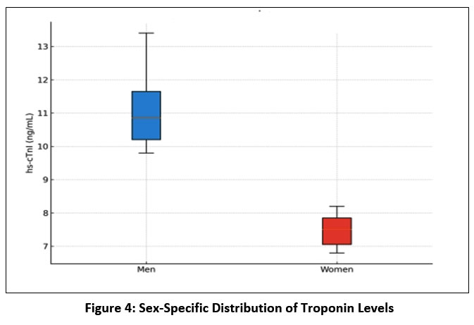 For high-sensitivity cardiac troponin I (hs-cTnI), the distribution was significantly influenced by sex. Women exhibited notably lower median values compared to men, although with considerable overlap in the interquartile ranges between the two groups (Figure 1).