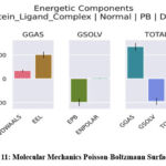 The free energy calculations using both Poisson-Boltzmann (PB) and Generalized Born (GB) models provided critical insights into the stability and dynamics of the protein-ligand interaction. The PB analysis ( Fig 11) revealed a significant van der Waals contribution of -33.70 kcal/mol, indicative of strong hydrophobic interactions, and an electrostatic contribution of -100.65 kcal/mol, highlighting the importance of charged residue interactions in stabilizing the complex. Polar solvation energy was calculated as 98.75 kcal/mol, partially offsetting the binding energy due to desolvation penalties, while the nonpolar solvation contribution of -4.01 kcal/mol further stabilized the interaction. The total binding energy using the PB model was -39.61 kcal/mol, confirming robust ligand binding.